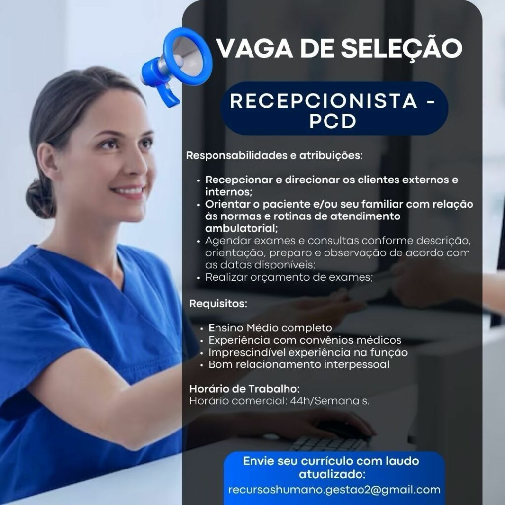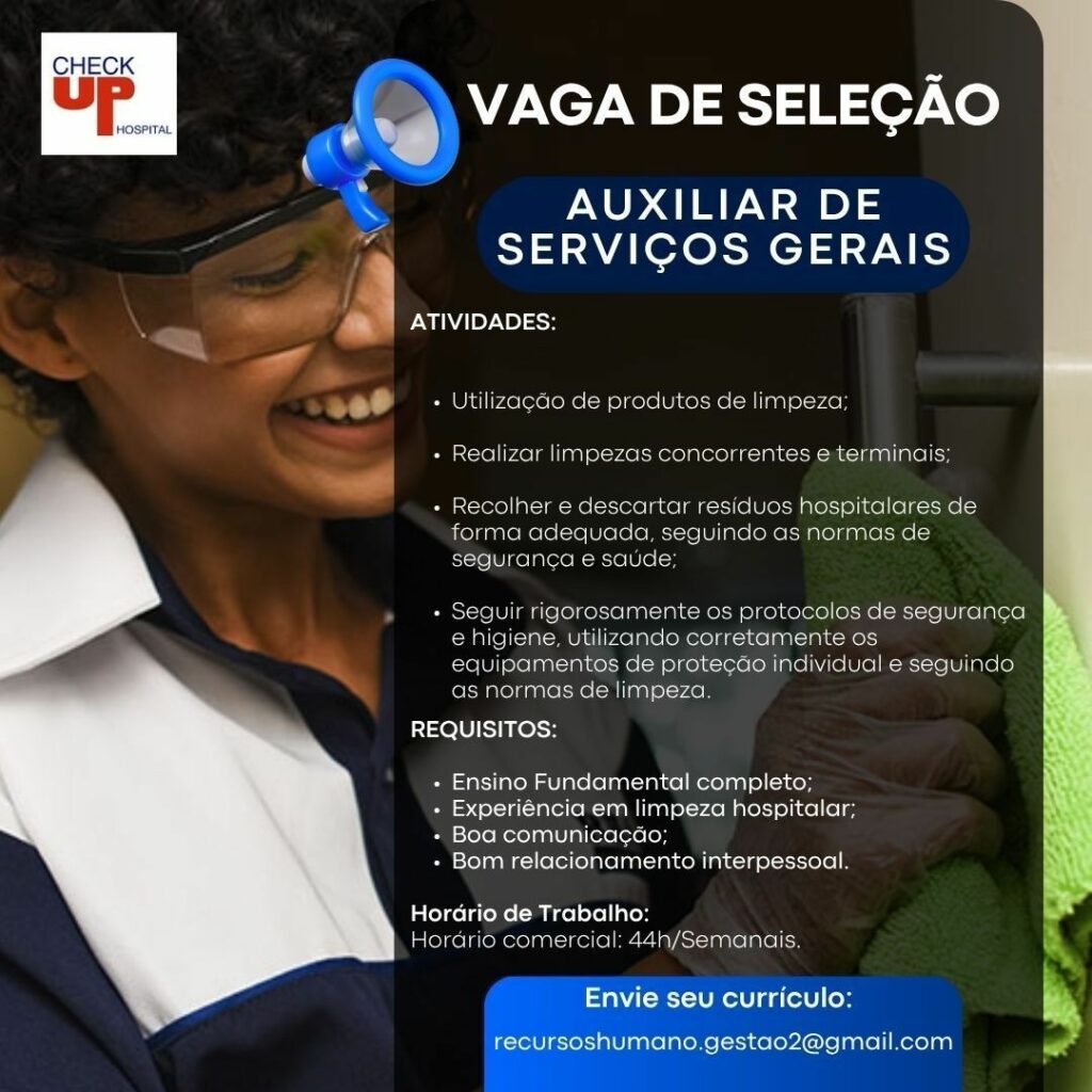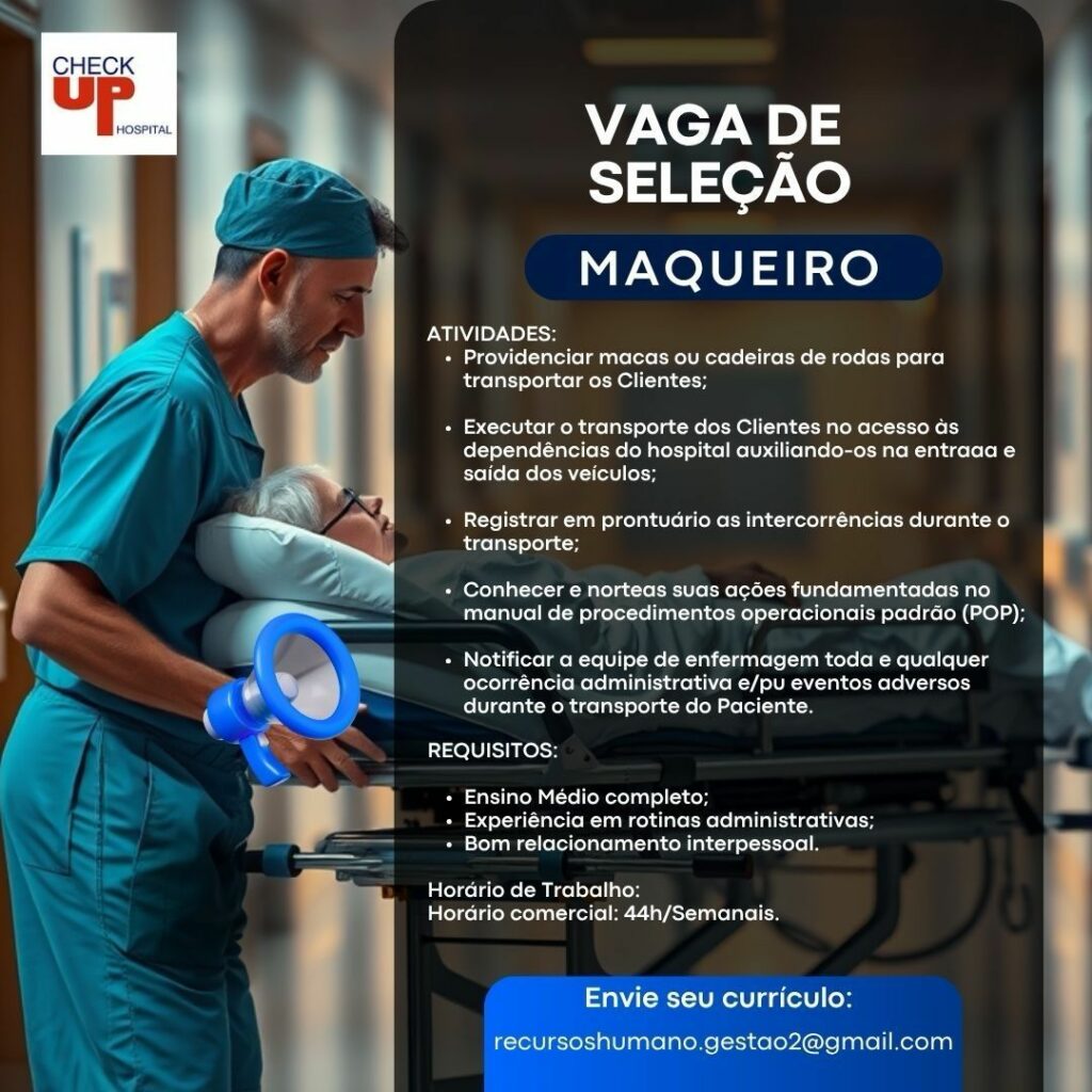 Hospital Check up seleciona Maqueiro, Auxiliar de serviços gerais, Recepcionista; Envie seu currículo!