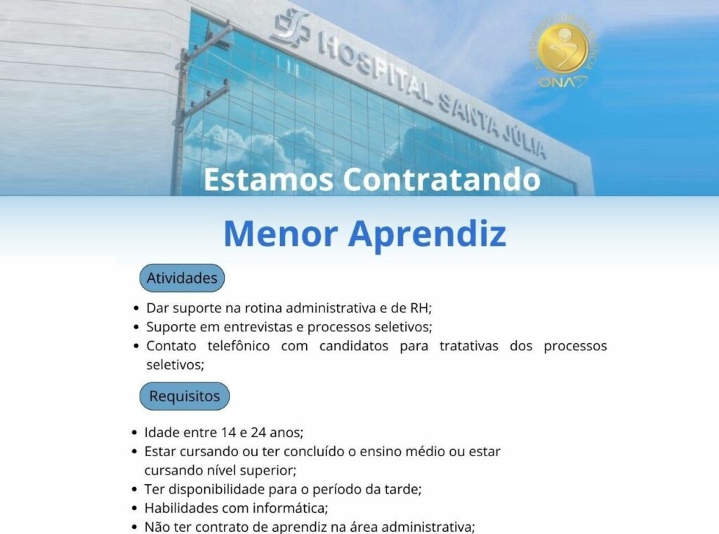 Hospital Santa Júlia está selecionando Menor Aprendiz; Envie seu currículo!