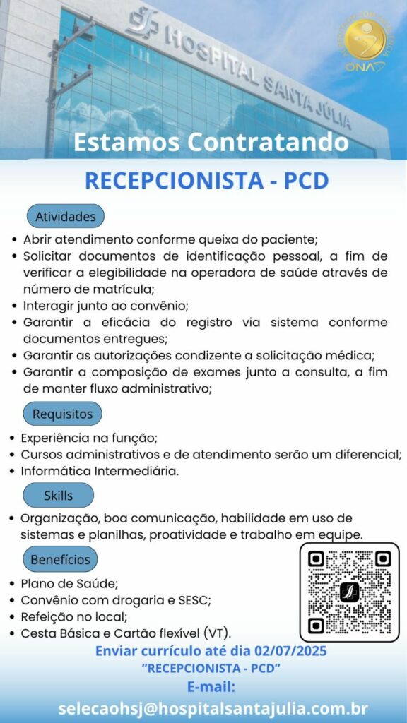 Hospital Santa Júlia seleciona Recepcionista; Envie seu currículo!