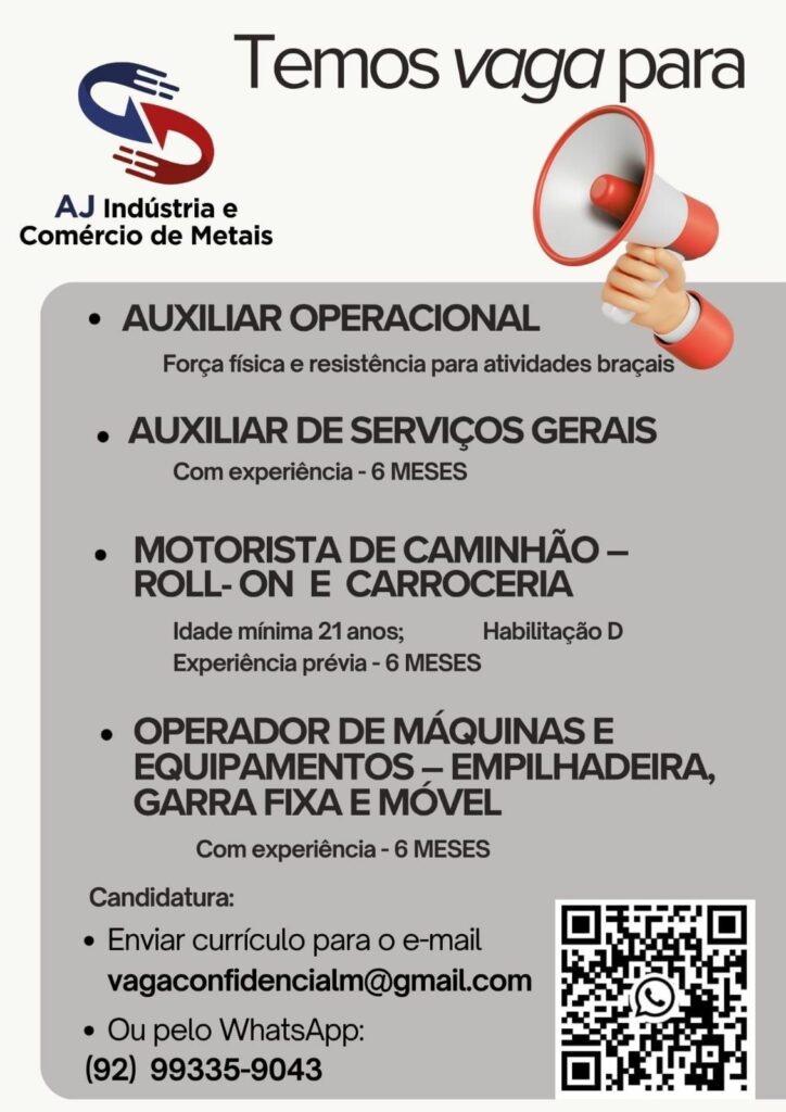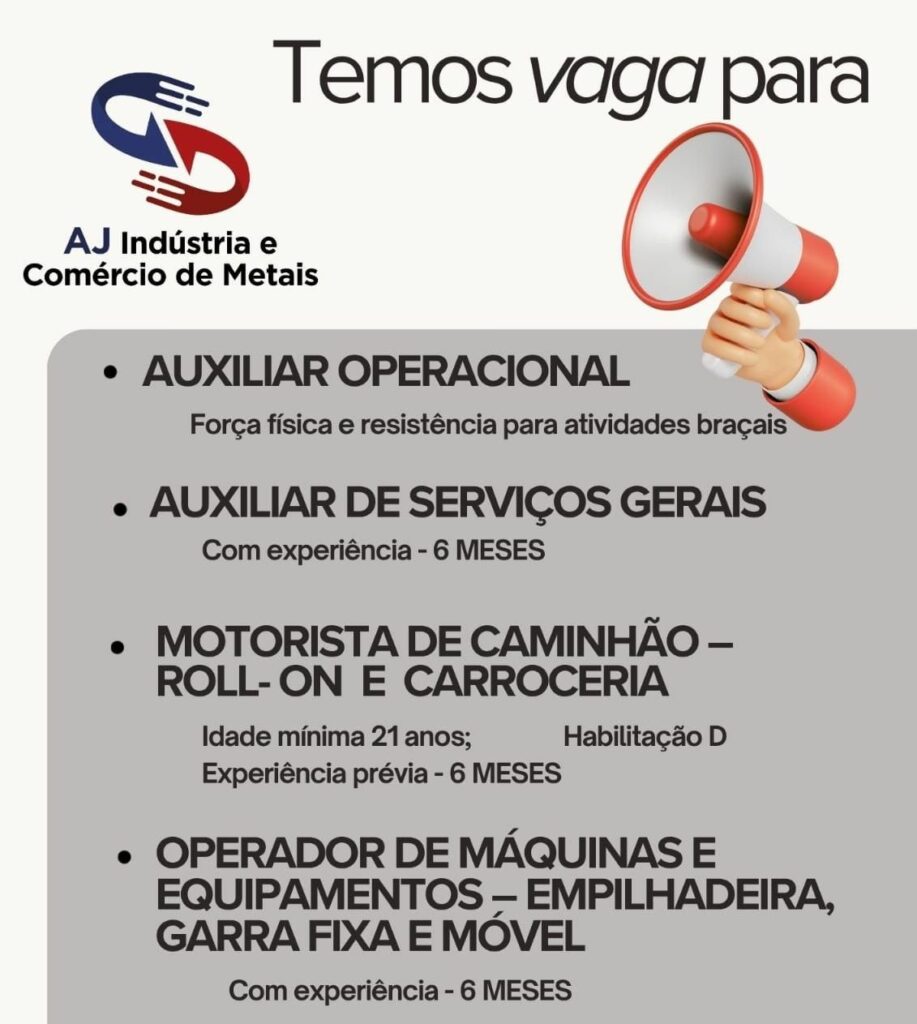 Indústria e comércio de metais seleciona Auxiliar operacional, Auxiliar de serviços gerais, Motorista de caminhão Rollon e carroceria, Operador de máquinas e equipamentos empilhadeira garra fixa e móvel; Envie seu currículo!