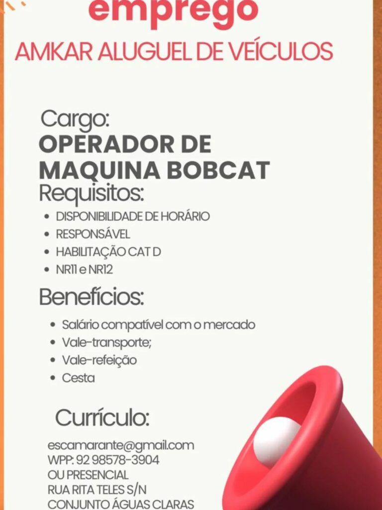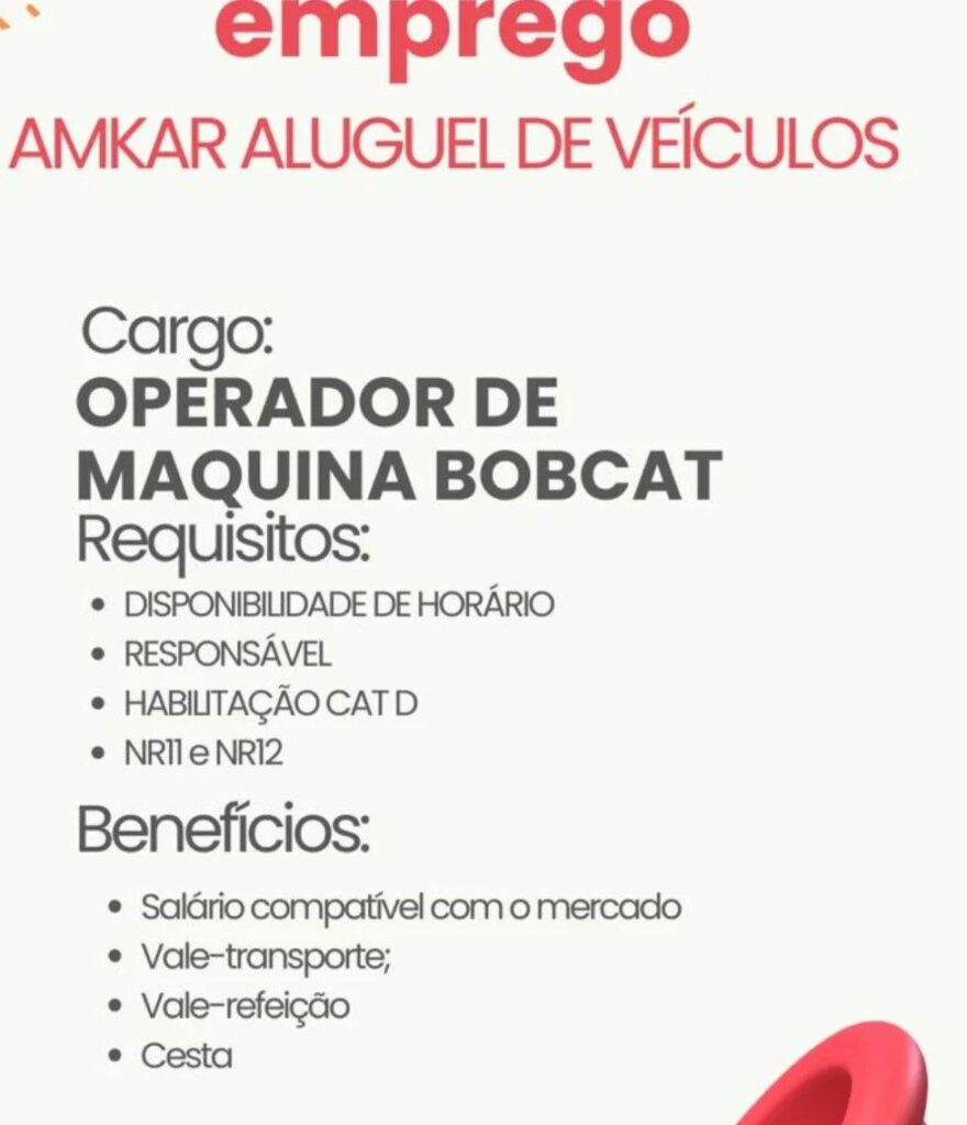 Locadora de veículos seleciona Operador de máquina bobcat; Envie seu currículo!