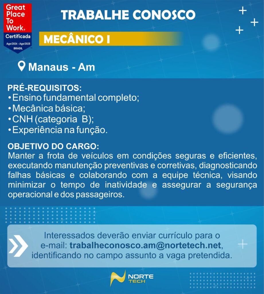 Norte Tech está selecionando Mecânico l; Envie seu currículo!