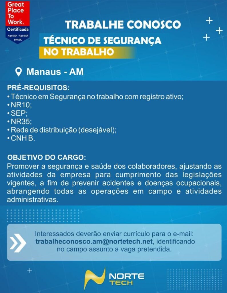 Norte Tech seleciona Técnico de segurança do trabalho; Envie seu currículo!