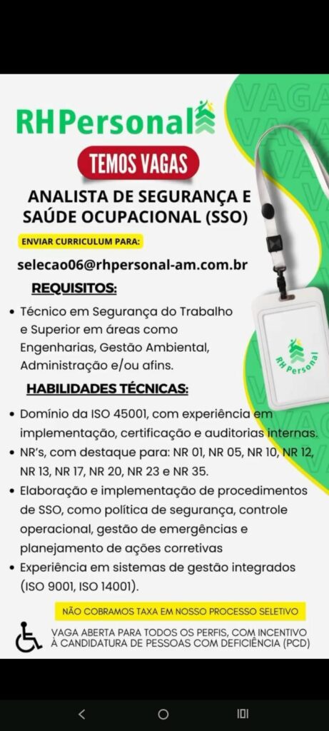 Rh está selecionando Analista de segurança e saúde ocupacional (sso); Envie seu currículo!