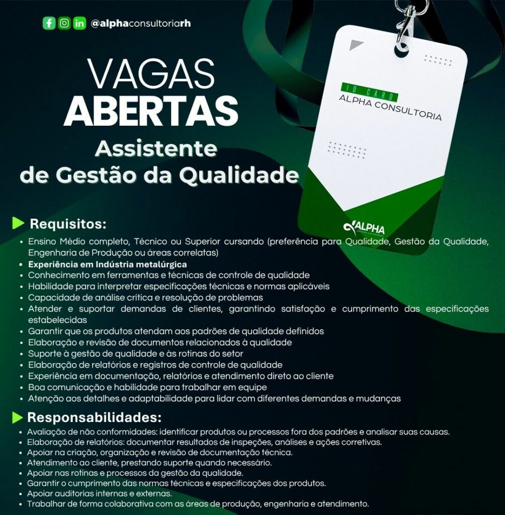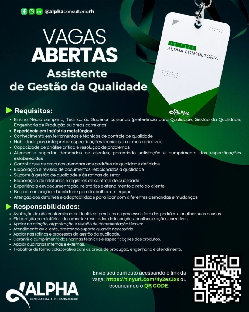Rh está selecionando Assistente de gestão da qualidade; Envie seu currículo!