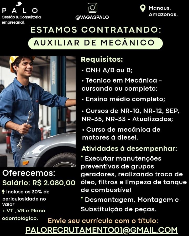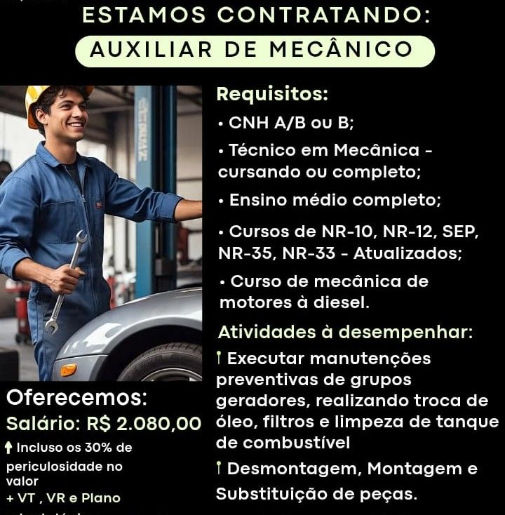 Rh está selecionando Auxiliar mecânico de máquinas pesadas; Envie seu currículo!