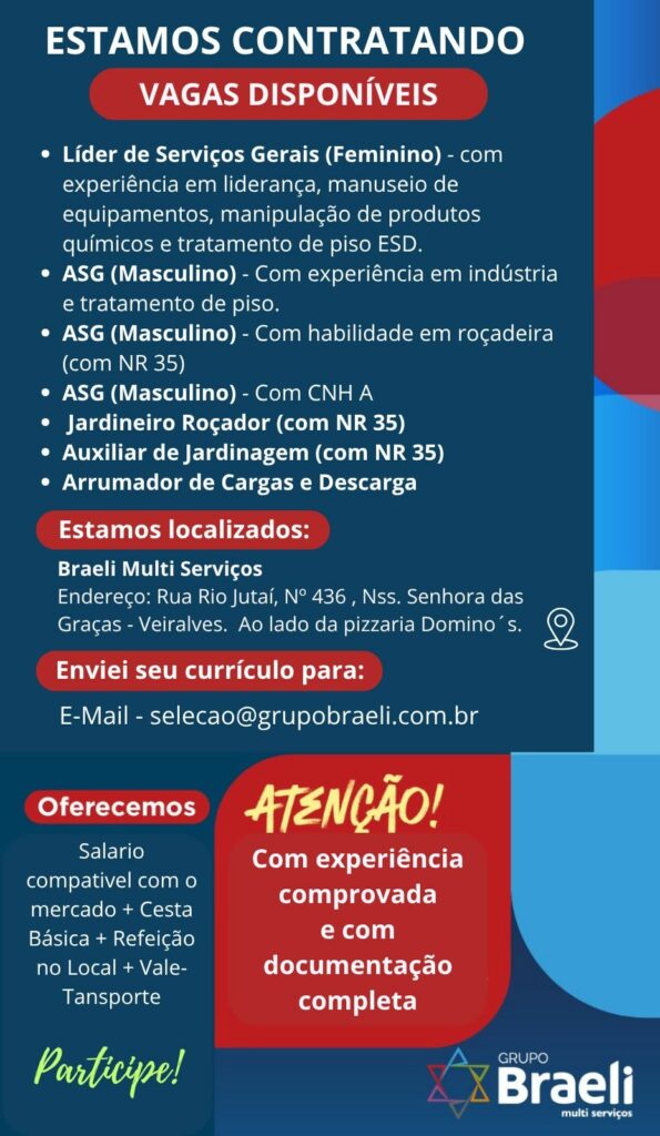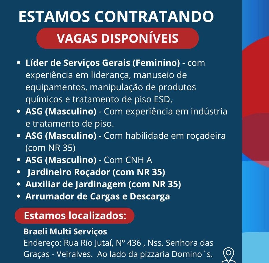 Rh está selecionando Líder de serviços gerais, ASG, Jardineiro roçador, Auxiliar de Jardinagem, Arrumador de carga e descarga; Envie seu currículo!