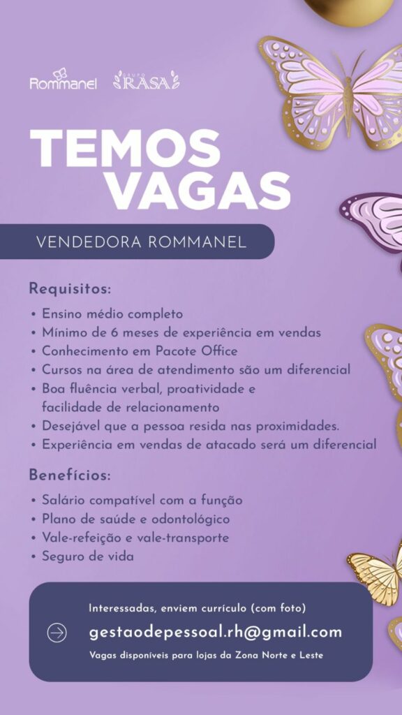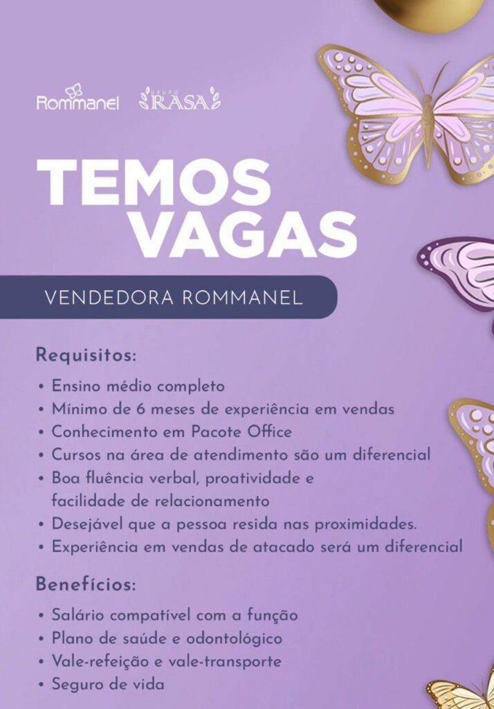 Rommanel está selecionando Vendedora; Envie seu currículo!