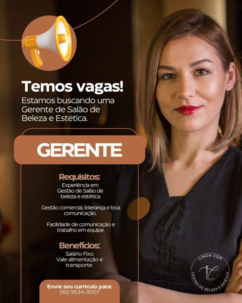 Salão de beleza e estética está selecionando Gerente; Envie seu currículo!