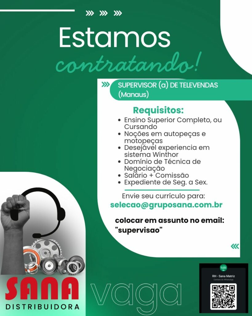 Sana distribuidora seleciona Supervisor (a) de televendas; Envie seu currículo!