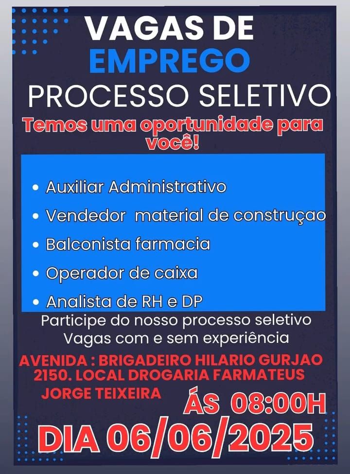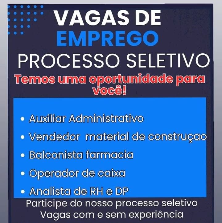 Seleção para seguintes vagas Auxiliar administrativo Vendedor material de construção, Balconista farmácia, Operador de caixa, Analista de rh, dp; Envie seu currículo!