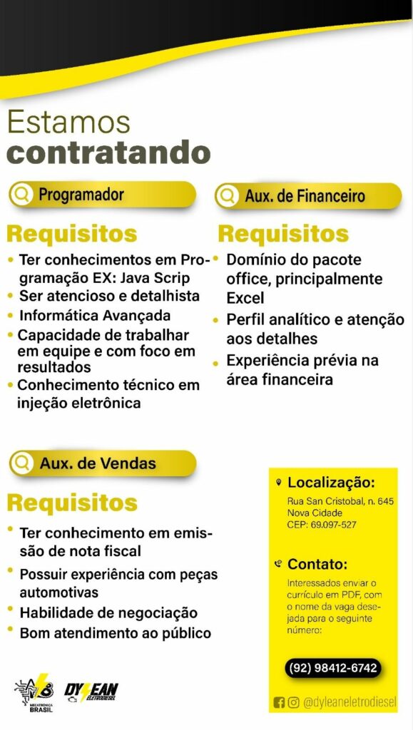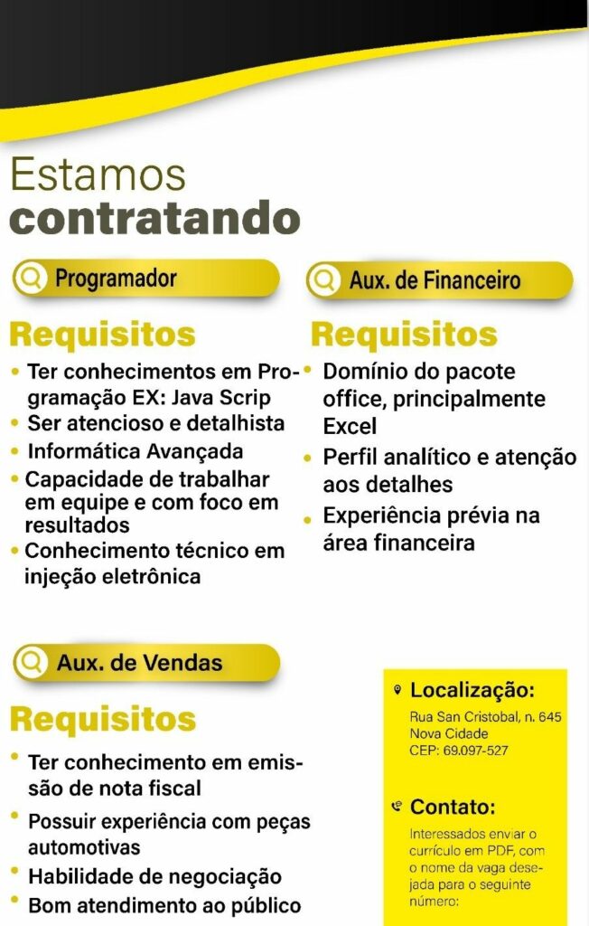 Seleção para seguintes vagas Programador, Auxiliar financeiro, Auxiliar de vendas; Envie seu currículo!
