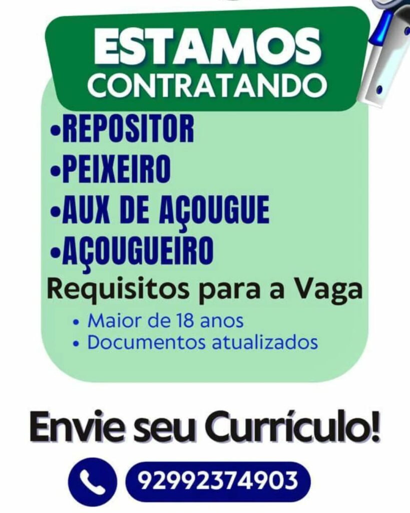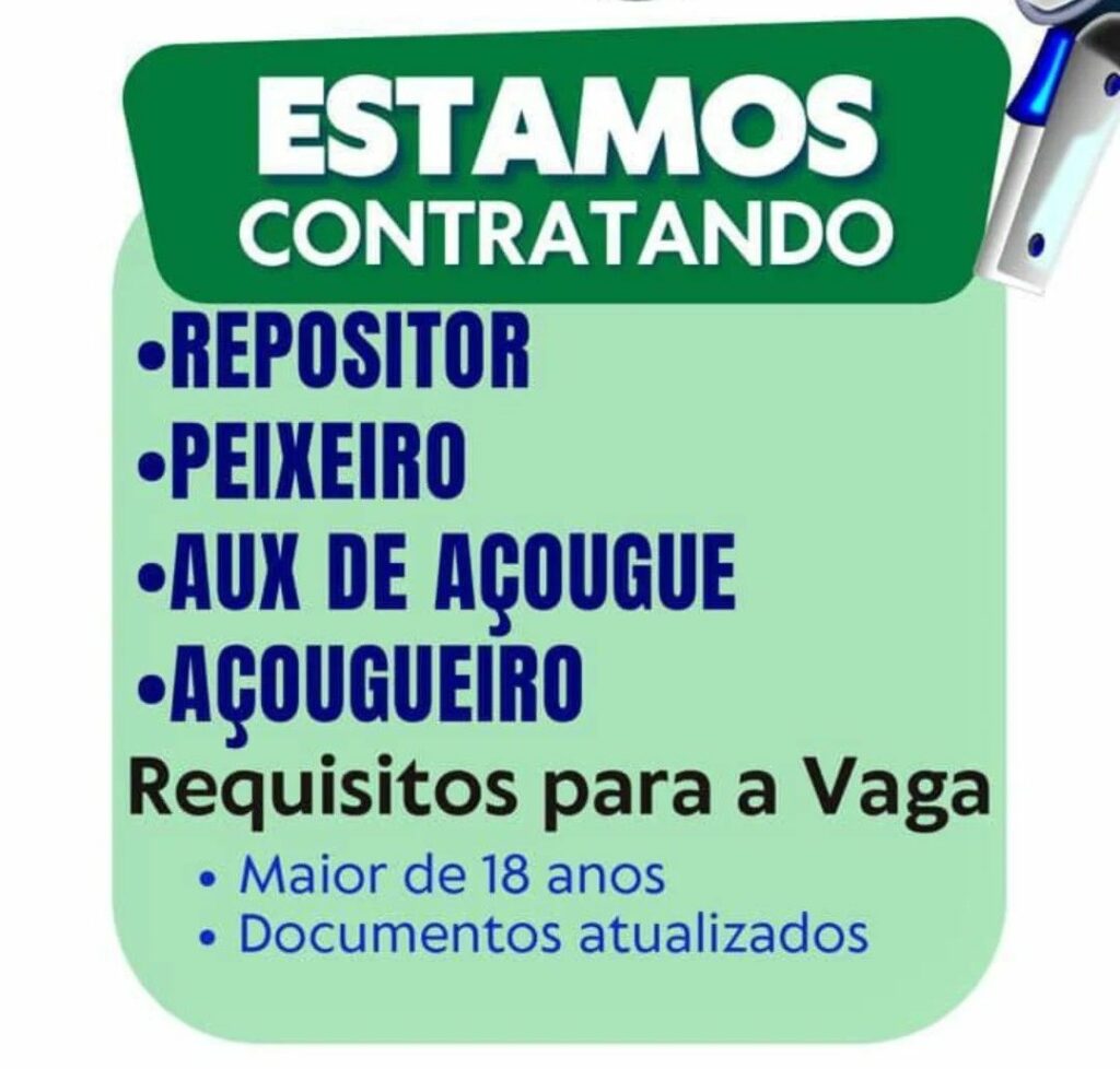 Seleção para seguintes vagas Repositor, Peixeiro, Auxiliar de açougue, Açougueiro; Envie seu currículo!