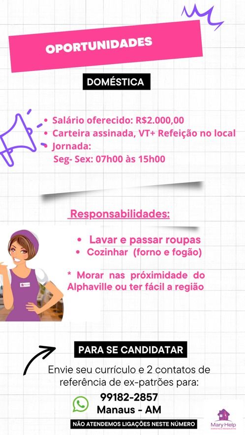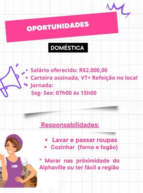 Seleção para vaga de Doméstica; Envie seu currículo!