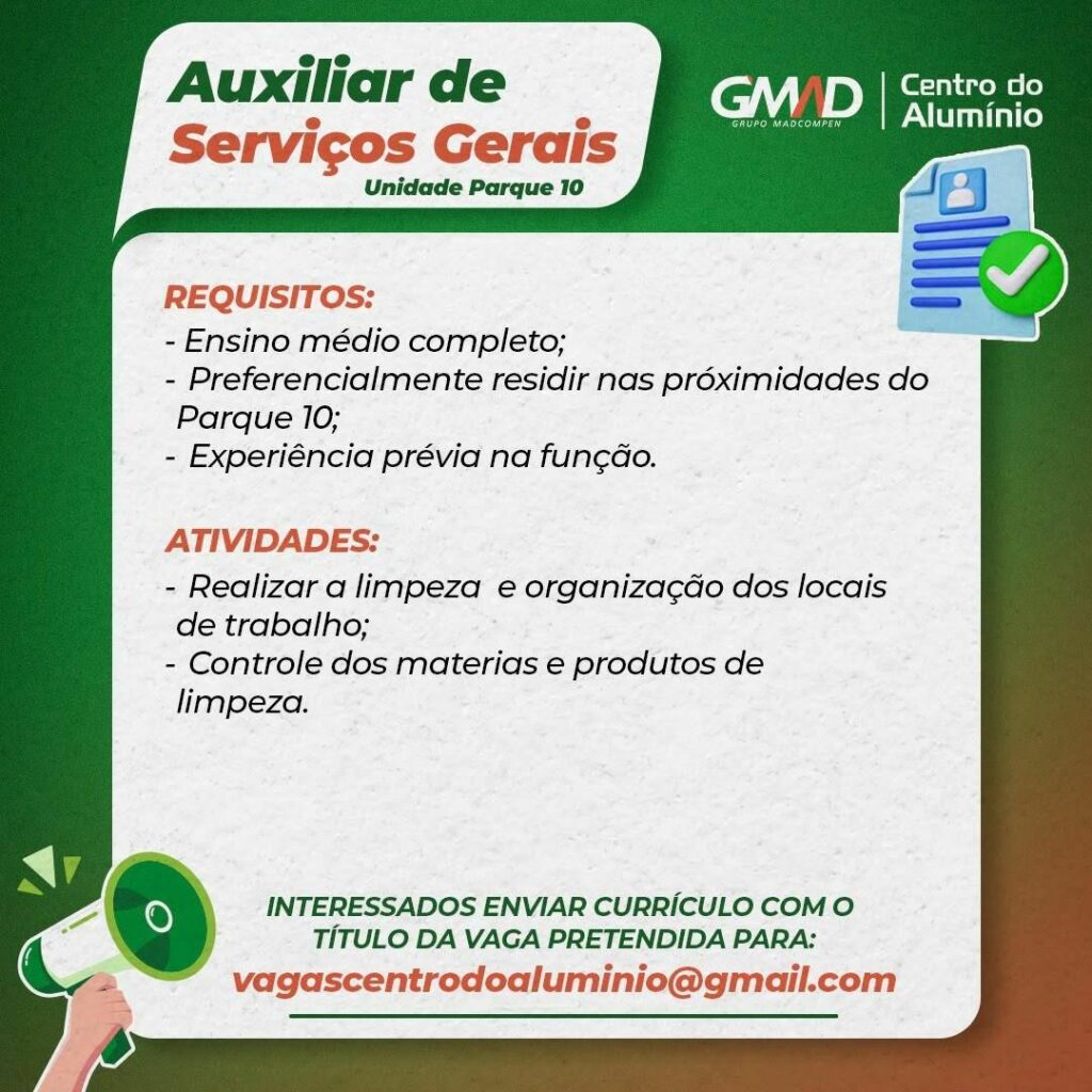 Centro do alumínio seleciona Auxiliar de serviços gerais; Envie seu currículo!