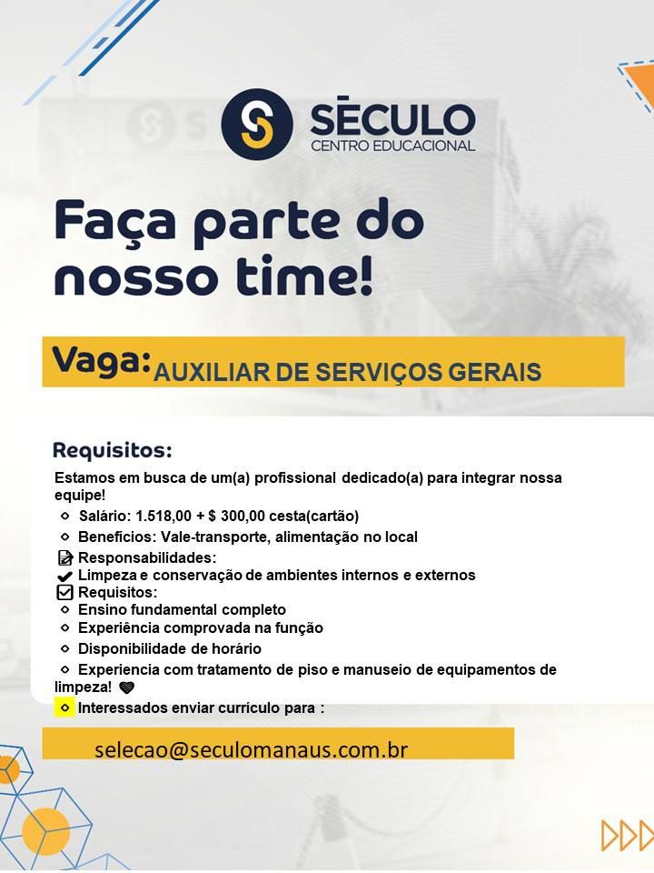 Centro educacional Século seleciona Auxiliar de serviços gerais; Envie seu currículo!