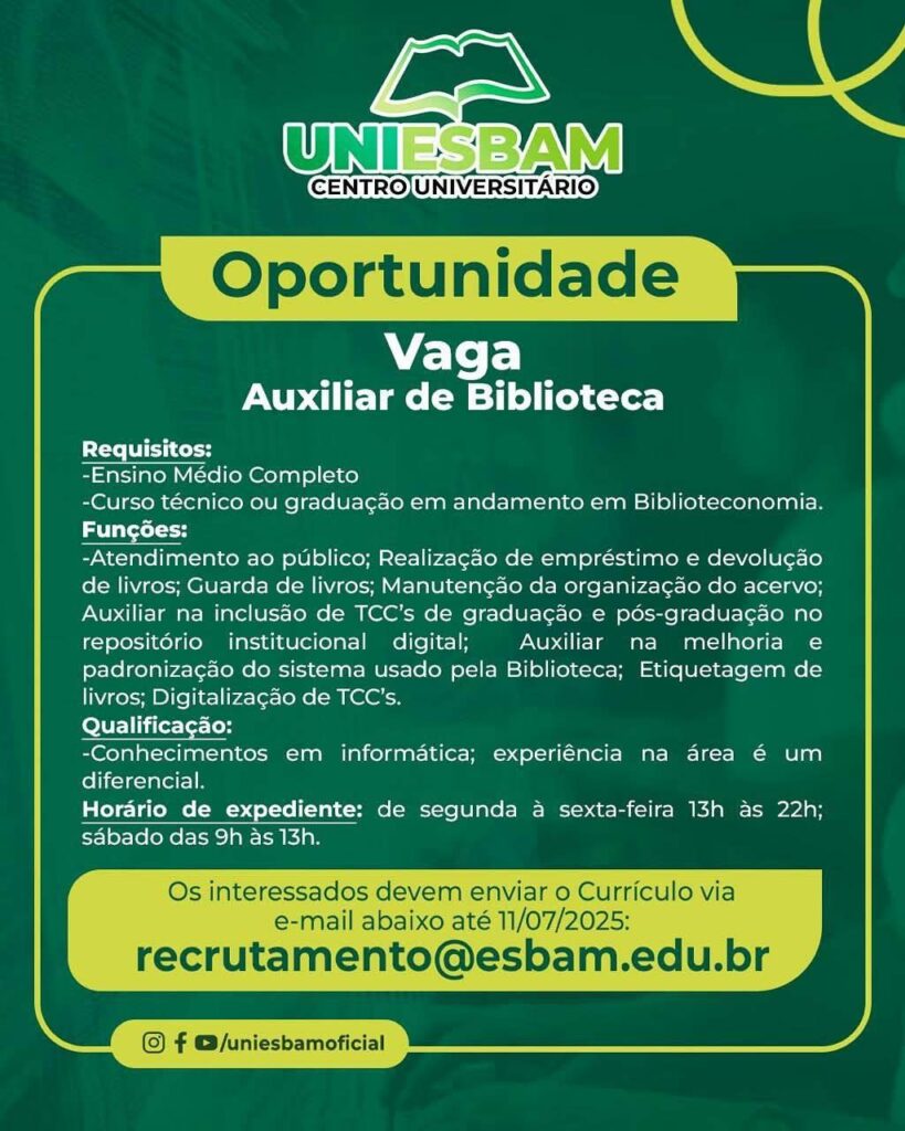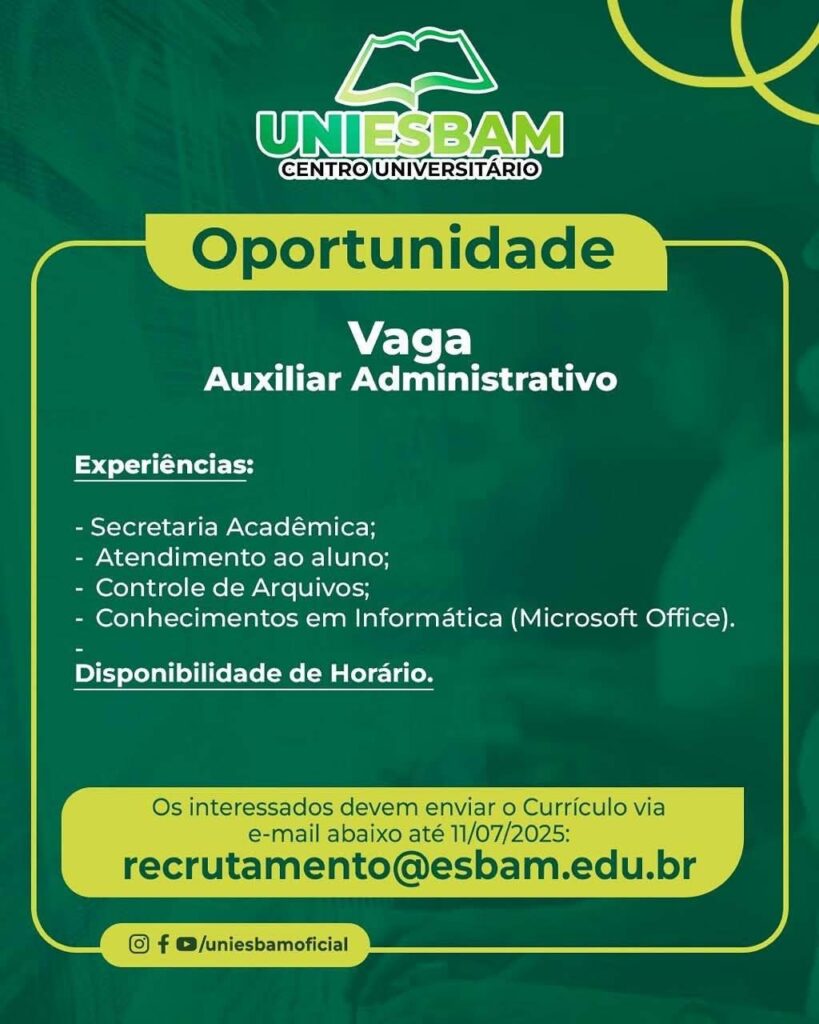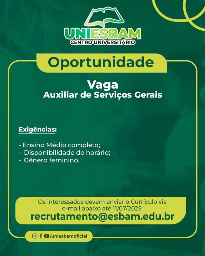 Centro Universitário Esbam seleciona Auxiliar de serviços gerais, Auxiliar administrativo, Auxiliar de biblioteca; Envie seu currículo!