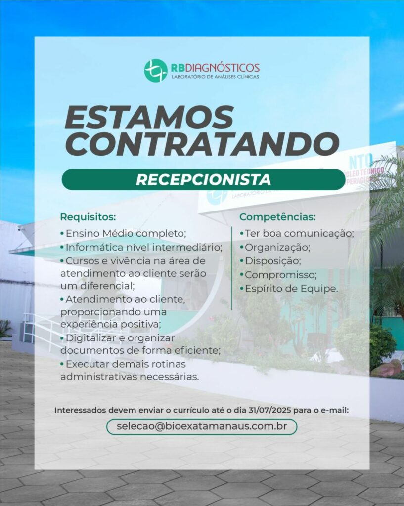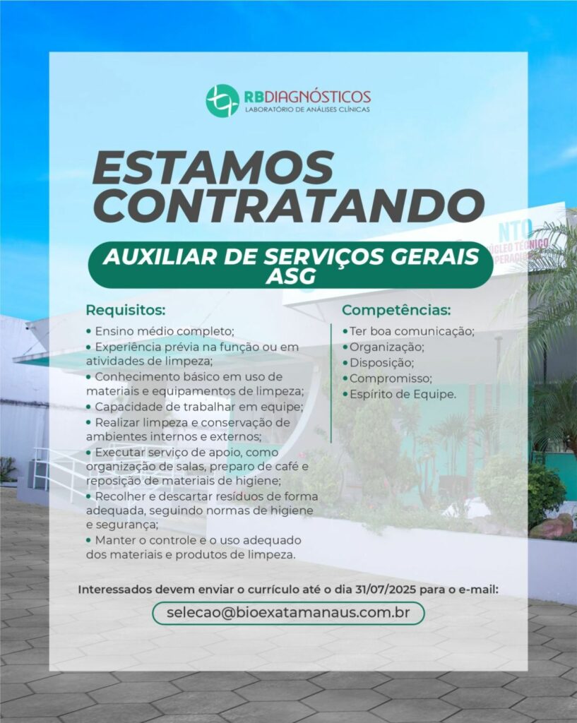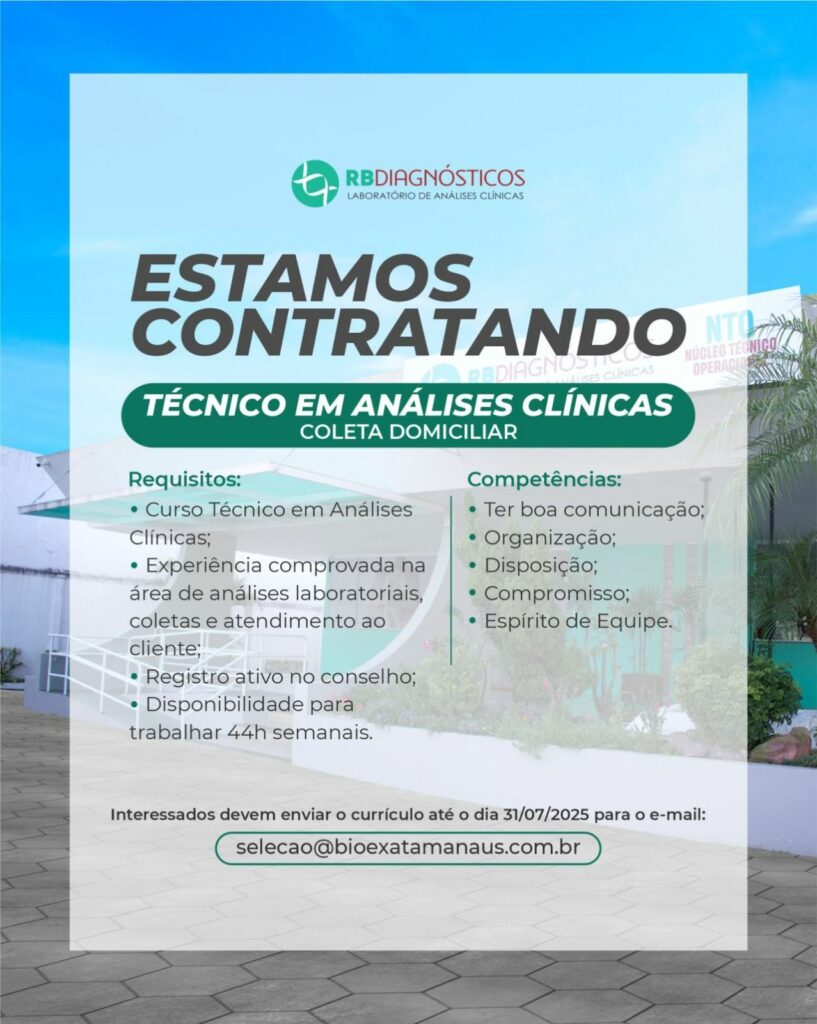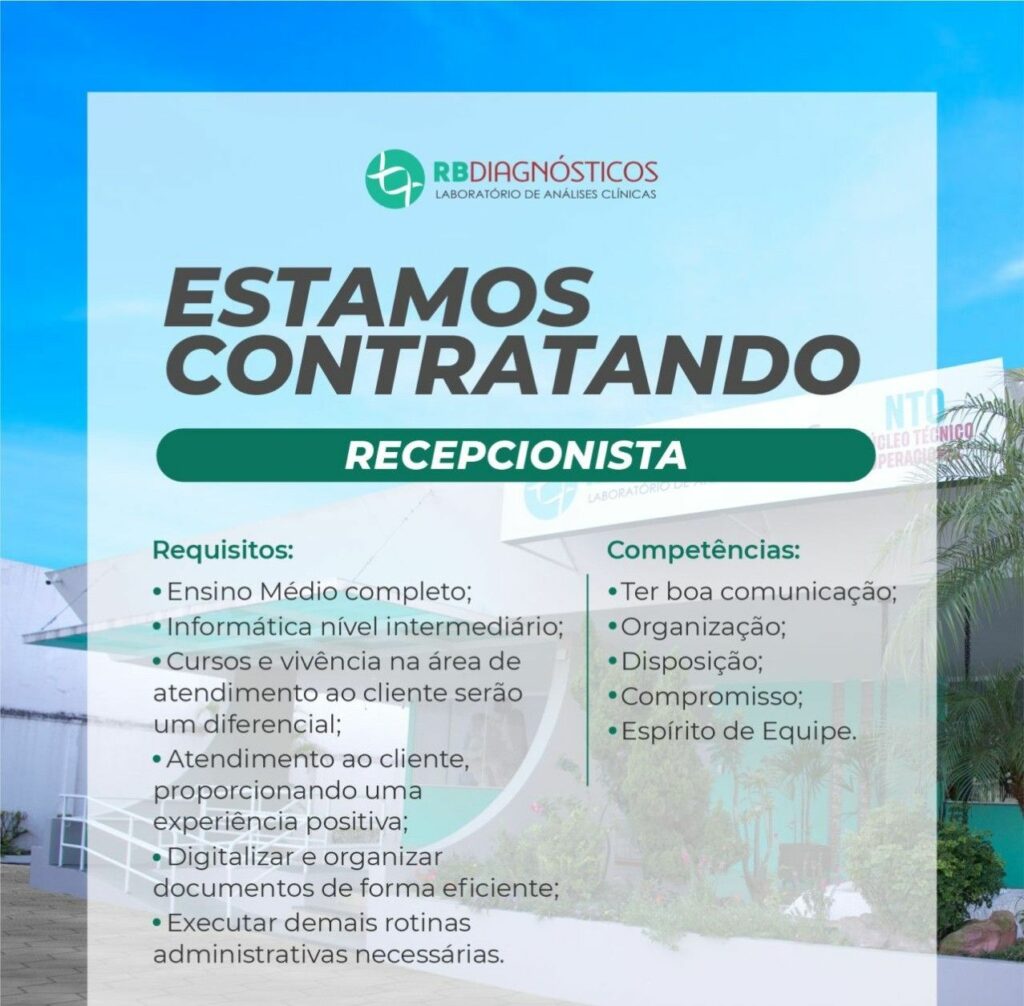 Clínica seleciona Auxiliar de serviços gerais, Técnico em Análises clínicas, Recepcionista; Envie seu currículo!
