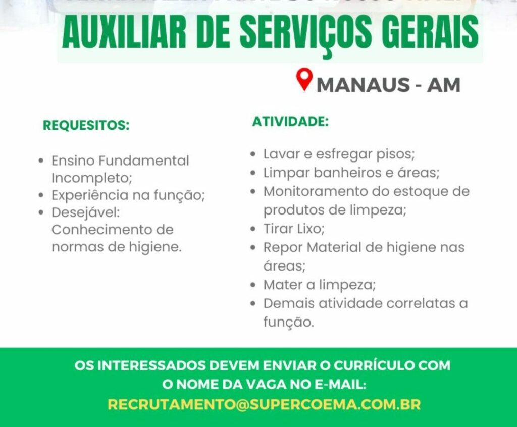 Coema Supermercado seleciona Auxiliar de serviços gerais; Envie seu currículo!