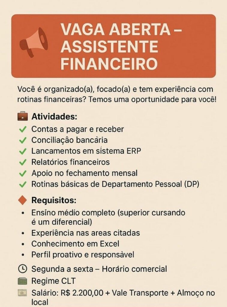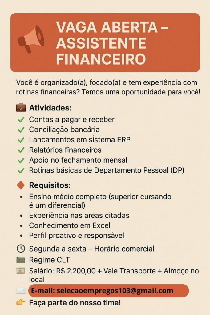 Empresa está selecionando Assistente financeiro; Envie seu currículo!