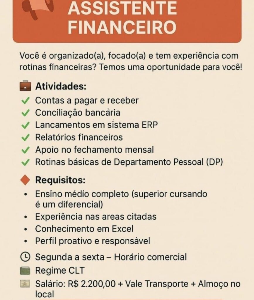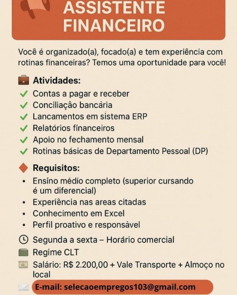 Empresa está selecionando Assistente financeiro; Envie seu currículo!