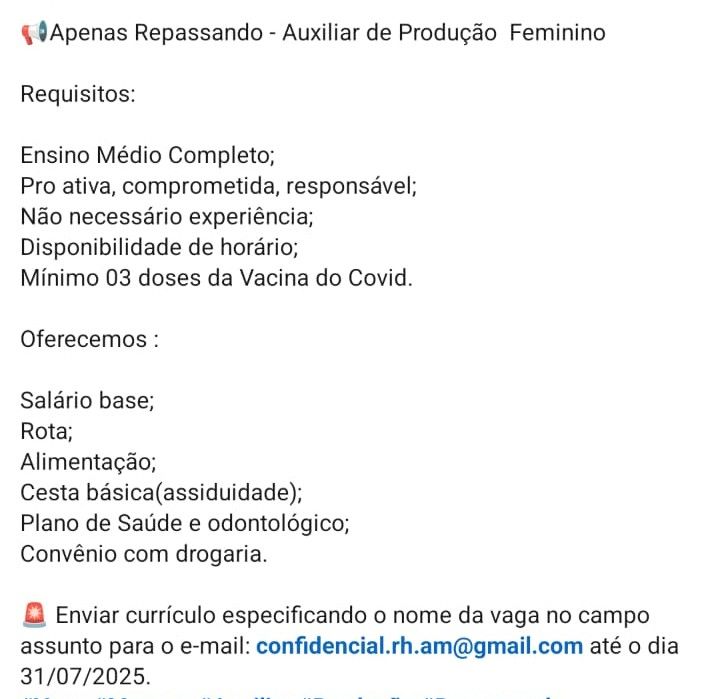 • Empresa está selecionando Auxiliar de produção; Envie seu currículo!