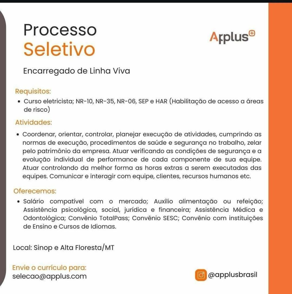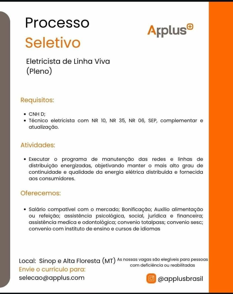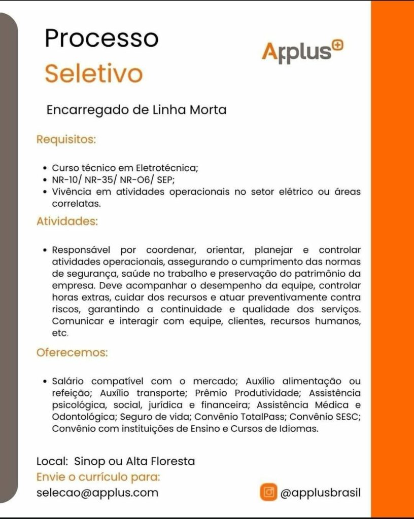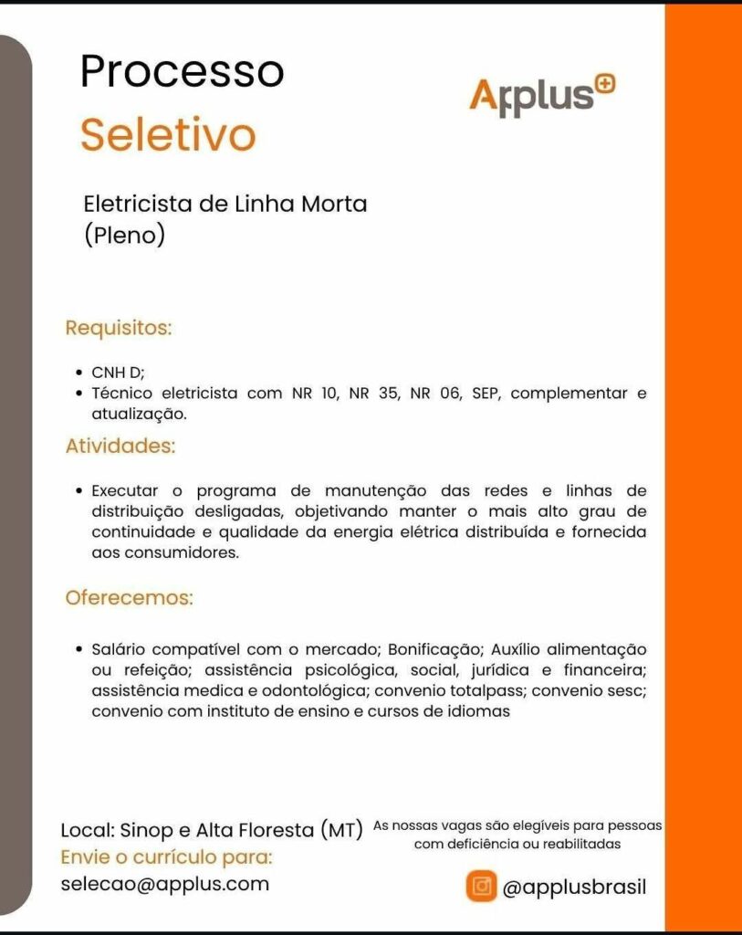 Empresa está selecionando Auxiliar técnico de programação, Encarregado de Linha viva, Auxiliar de frotas, Encarregado de Linha morta, Eletricista de linha morta plena, Eletricista de linha viva plena; Envie seu currículo!