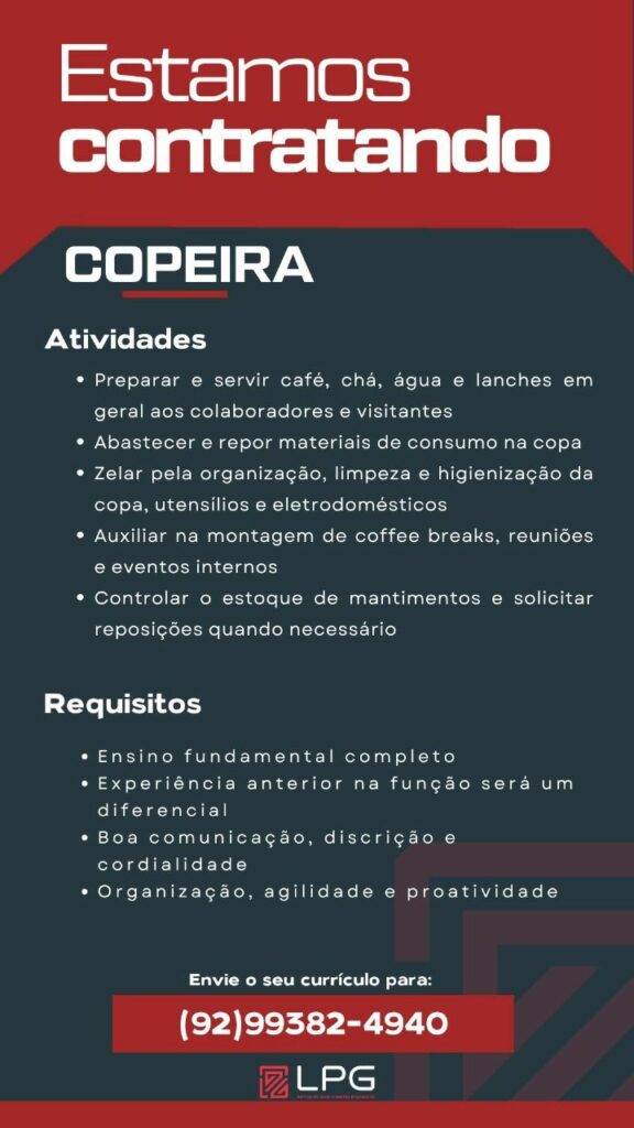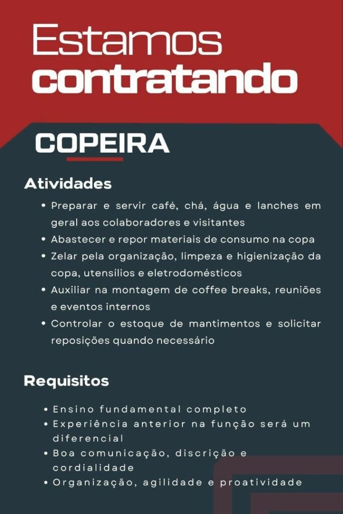 Empresa está selecionando Copeira; Envie seu currículo!