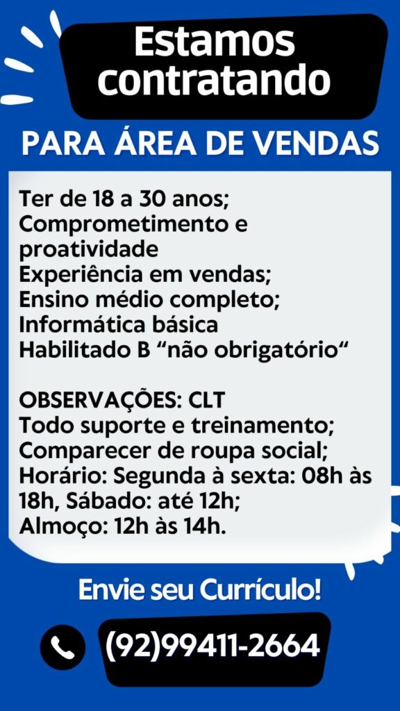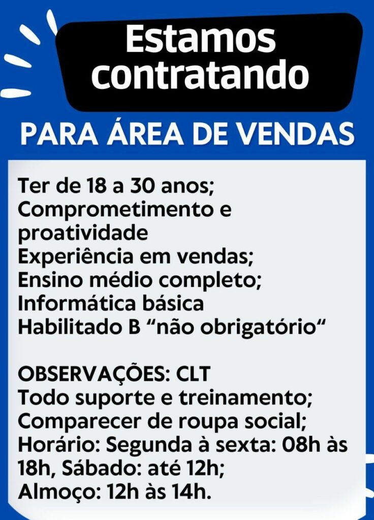 Empresa está selecionando para área Vendas; Envie seu currículo!