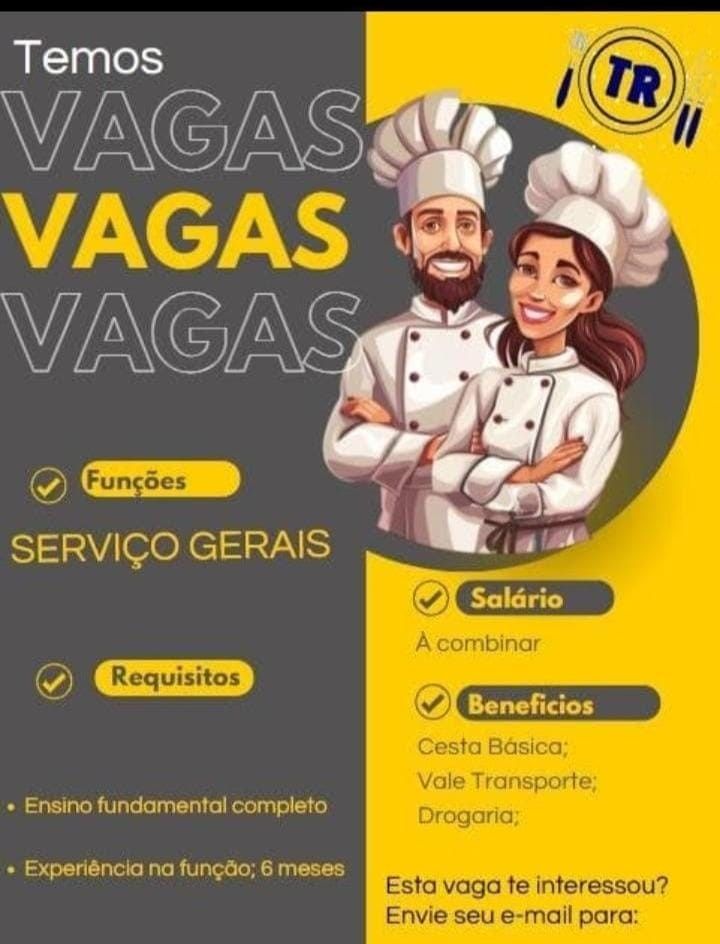 Empresa está selecionando Cozinheiro, Auxiliar de serviços gerais, Copeiro de salão; Envie seu currículo!