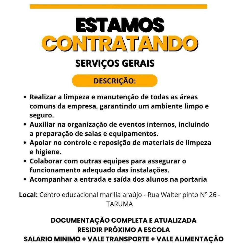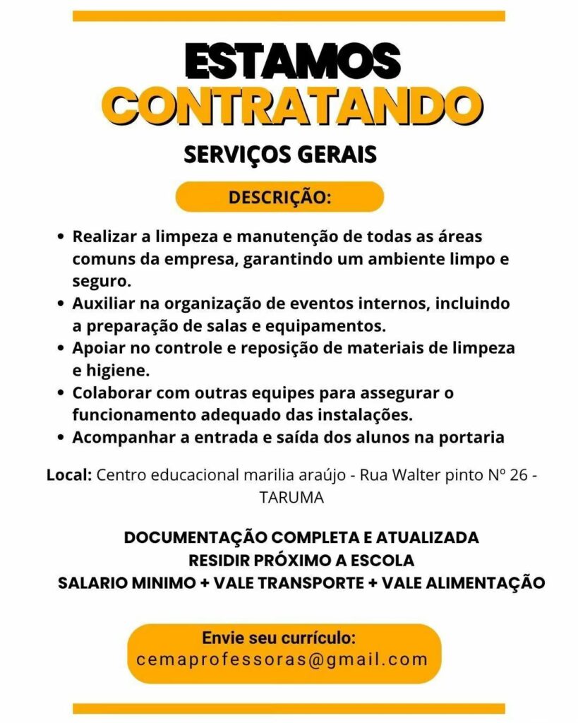 Empresa está selecionando Serviços Gerais; Envie seu currículo!