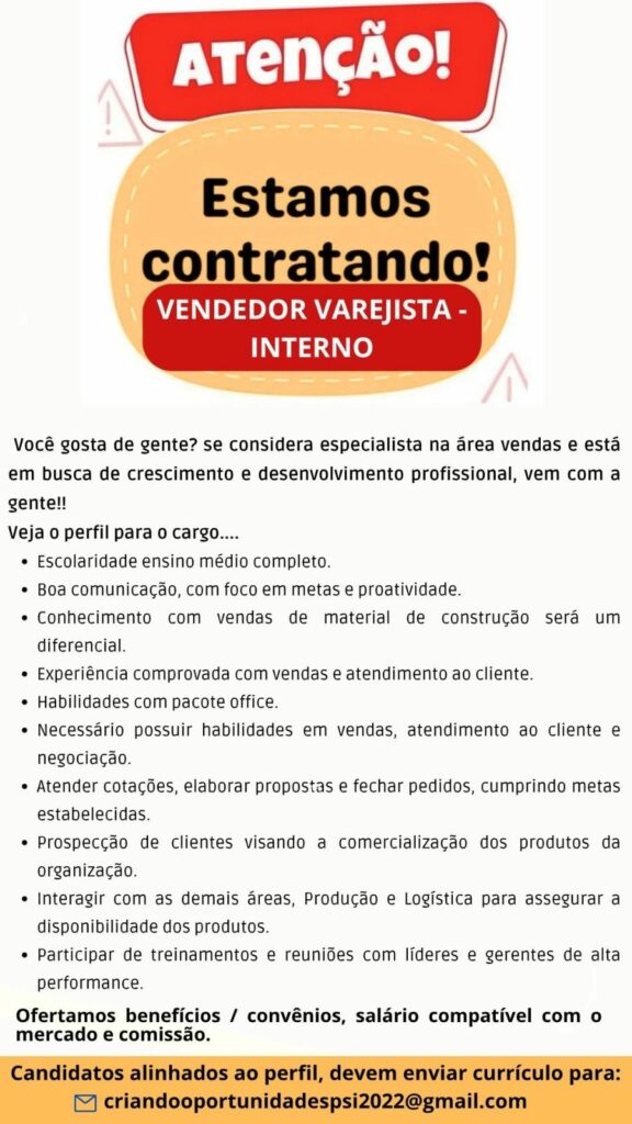 Empresa está selecionando Vendedor varejista interno; Envie seu currículo!