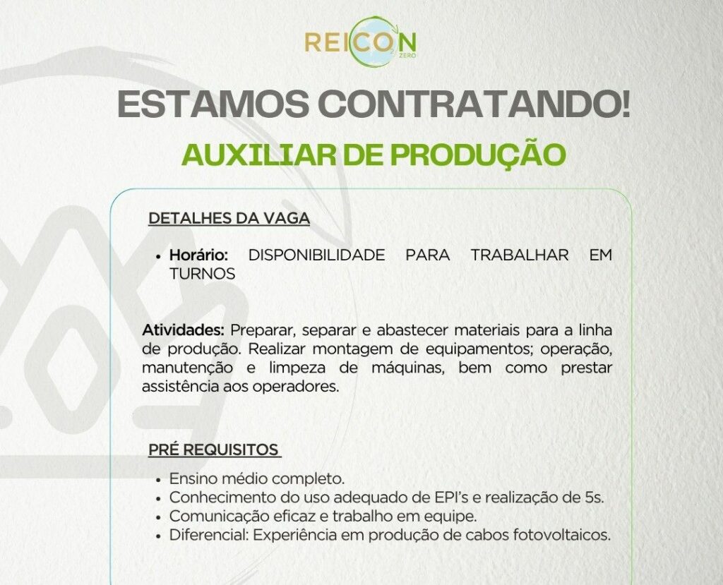 Empresa Recon está selecionando Auxiliar de produção; Envie seu currículo!