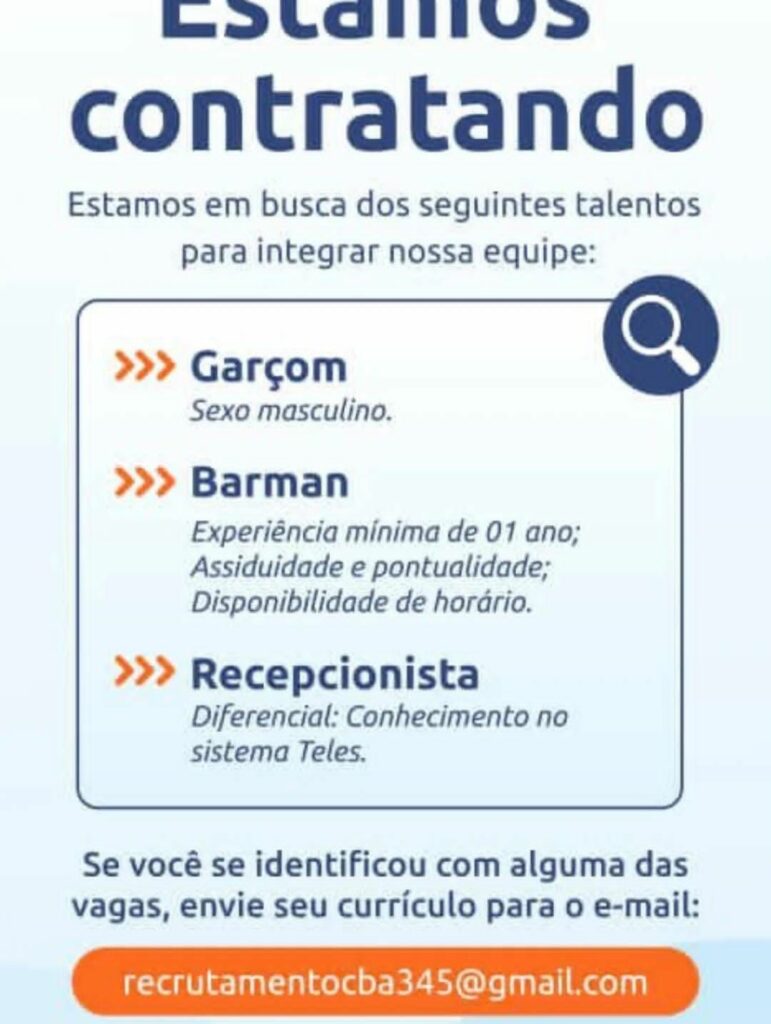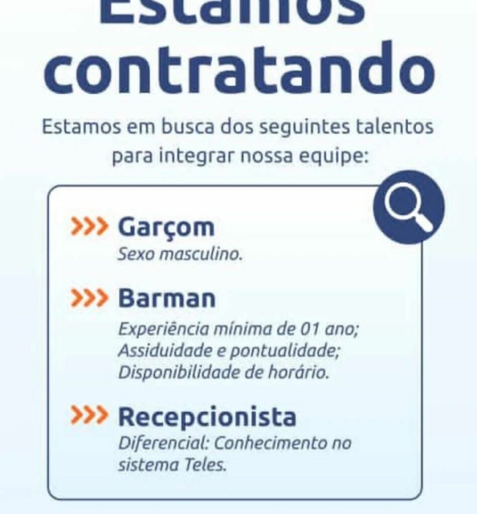 Empresa seleciona Garçom, Barman, Recepcionista; Envie seu currículo!