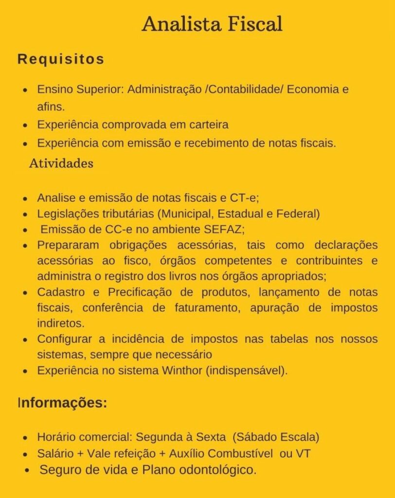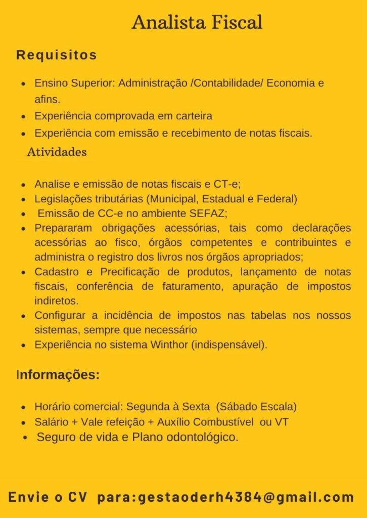 Empresa seleciona para vaga de Analista fiscal; Envie seu currículo!