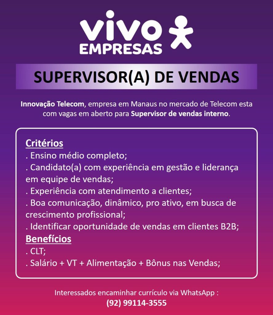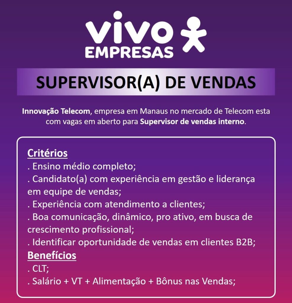Empresas Vivo seleciona Supervisor (a) de vendas; Envie seu currículo!