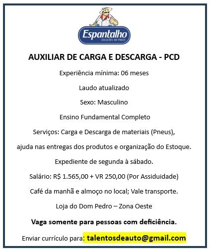 Espantalho pneus seleciona Auxiliar de carga e descarga; Envie seu currículo!