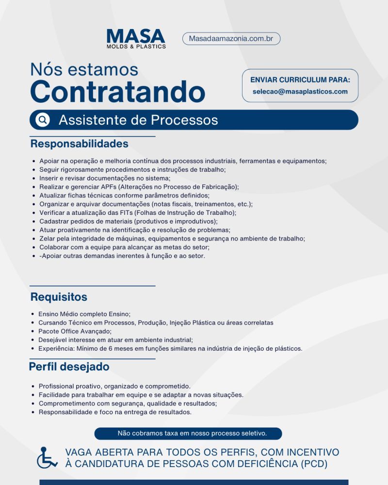 Fábrica da Masa está selecionando Assistente de processos; Envie seu currículo!