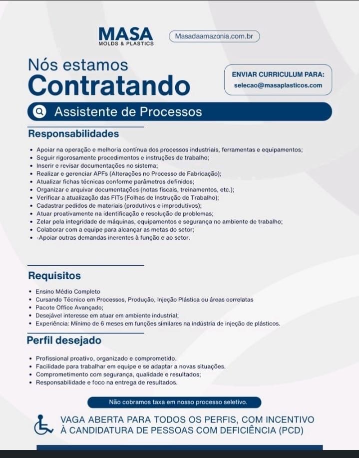 O processo seletivo para esta(s) vaga(s) não cobra absolutamente nada pela sua candidatura. Portanto, jamais aceite qualquer tipo de cobrança para cadastrar seu currículo.