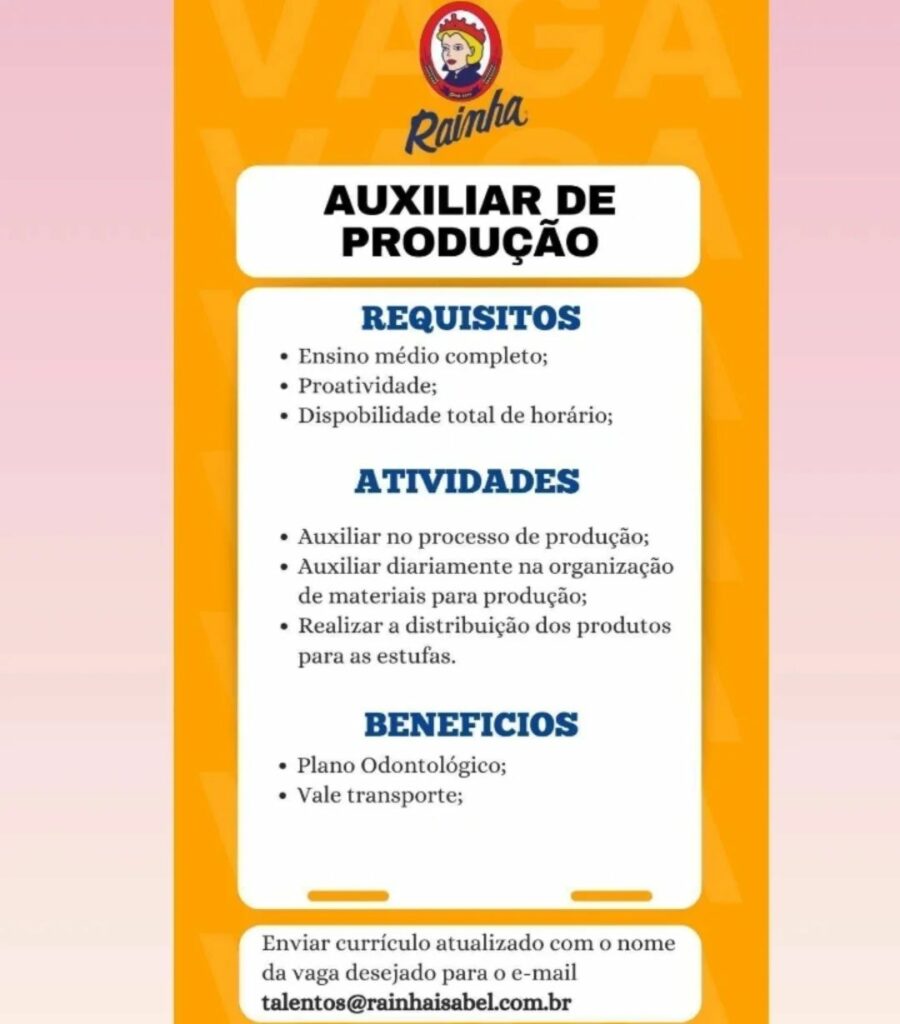 Fábrica Rainha Isabel está selecionando Auxiliar de produção; Envie seu currículo!