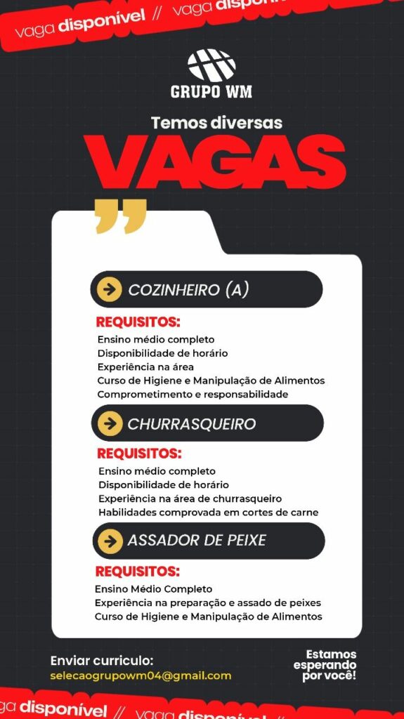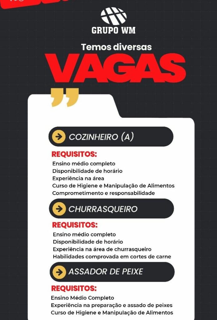Grupo WM Cozinheiro (a), Churrasqueiro, Assador de peixe; Envie seu currículo!