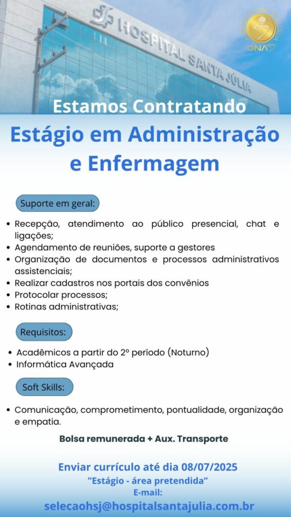 Hospital Santa Júlia está selecionando Estágio em Administração e Enfermagem; Envie seu currículo!
