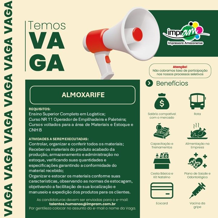 Nunca pague qualquer quantia para participar de um processo para que seja selecionado. Não compre nenhum curso, apostilas ou serviços que prometem participação na seleção ou contratação de uma vaga. E nunca insira dados bancários, cartões ou envie documentos por e-mail ou através de sites que não reconhecem. Não nos responsabilizamos por nenhum tipo de pagamento efetuado.