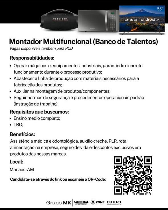 Indústria de grande porte contrata Montador Multifuncional; Envie seu currículo!