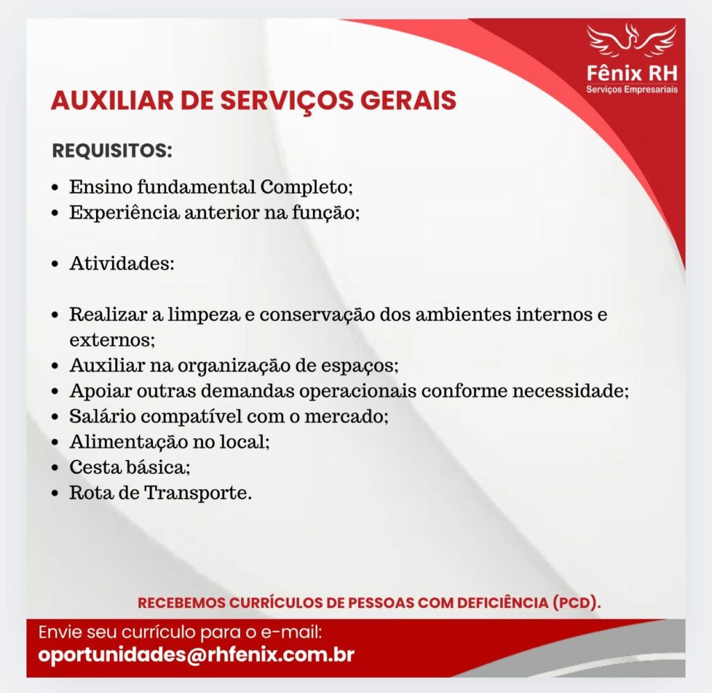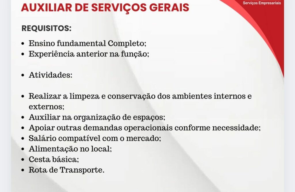 Rh está selecionando Auxiliar de serviços gerais; Envie seu currículo!