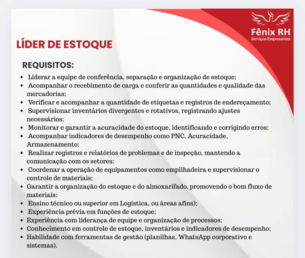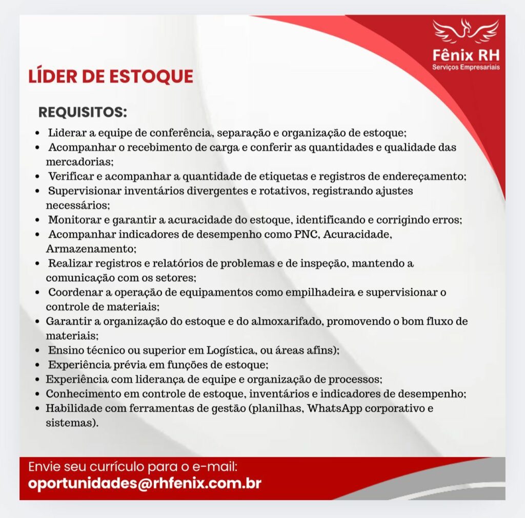 Rh está selecionando Líder de estoque; Envie seu currículo!
