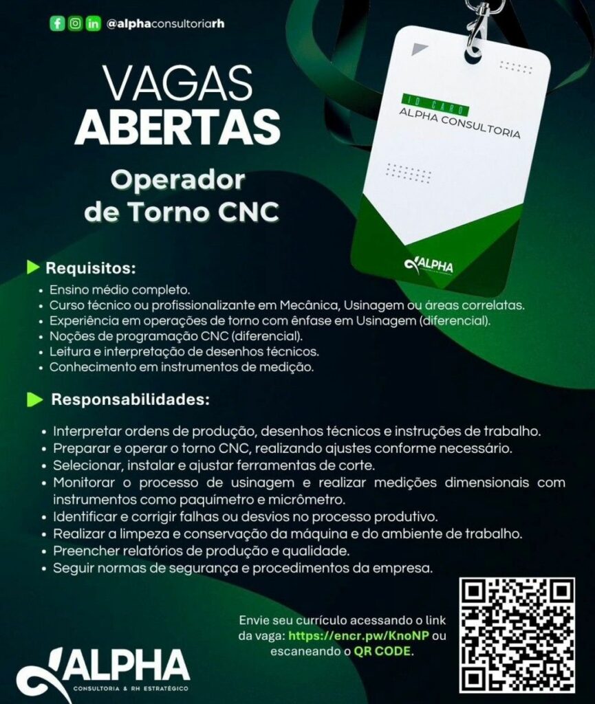 Rh está selecionando Operador de torno cnc; Envie seu currículo!