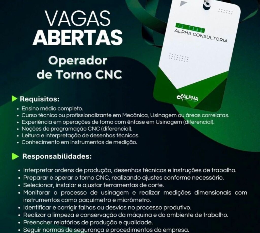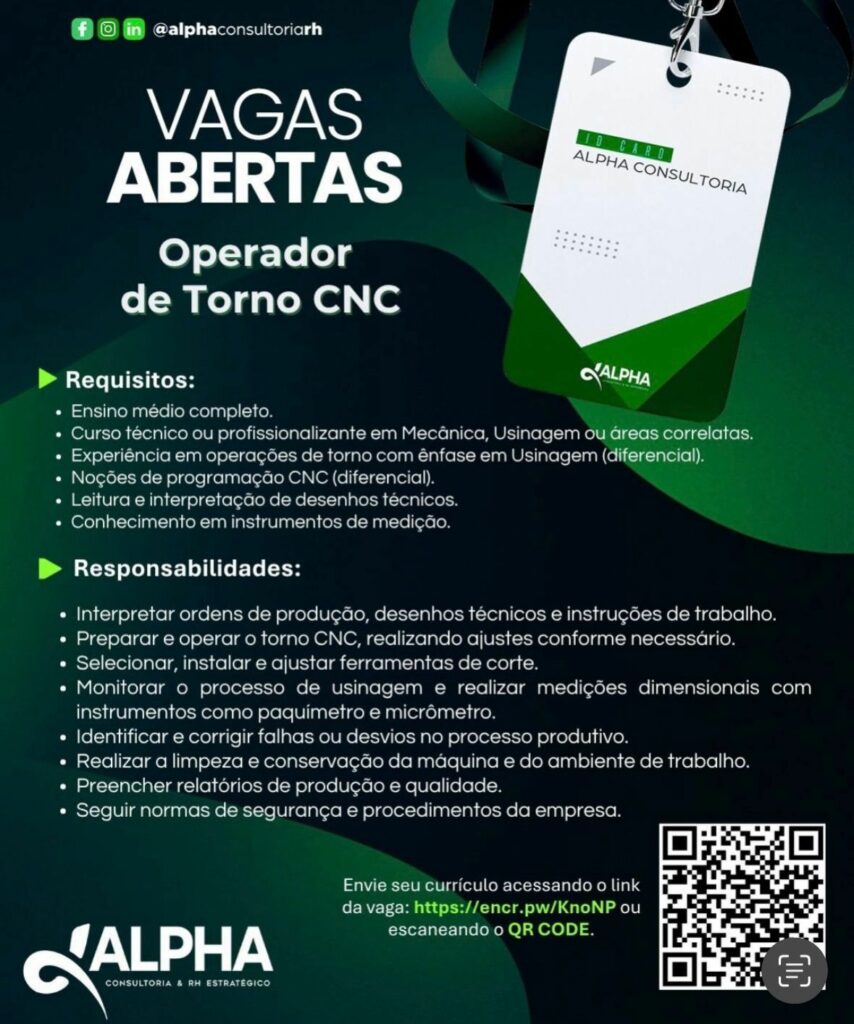 Rh está selecionando Operador de torno cnc; Envie seu currículo!