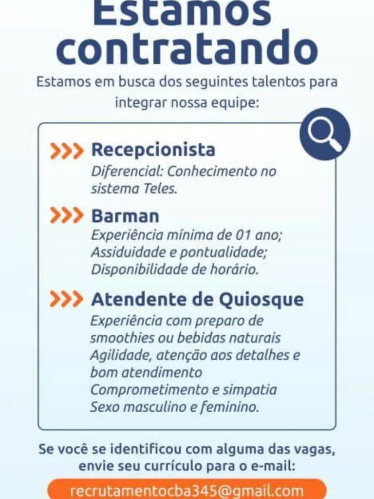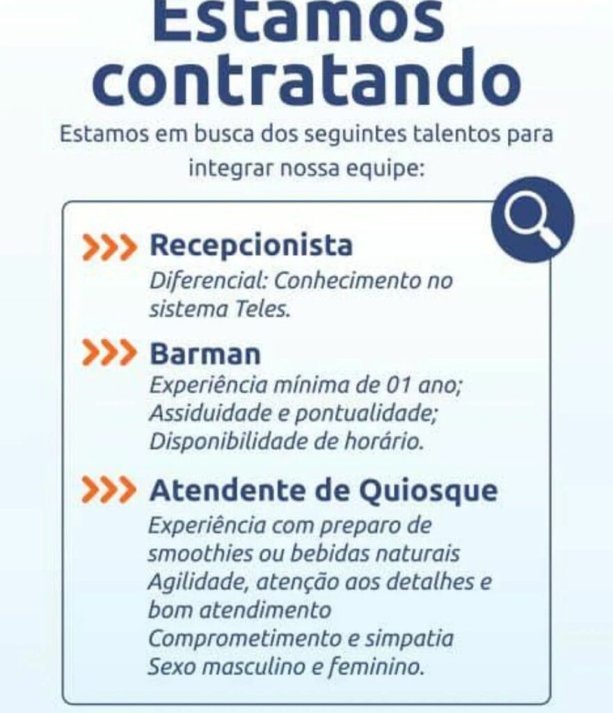 Seleção para seguintes vagas de emprego Recepcionista, Barman, Atendente de quiosque; Envie seu currículo!