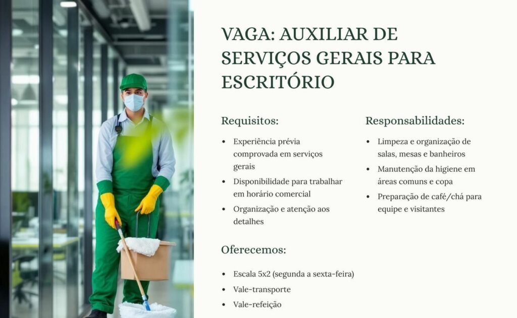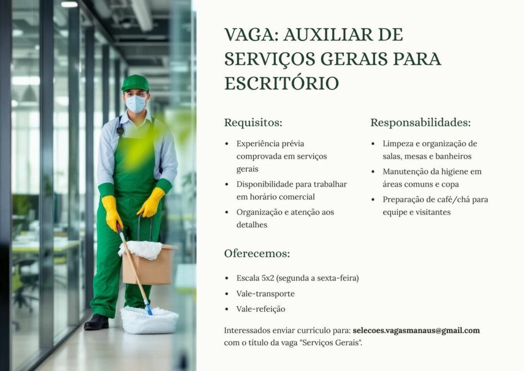 Seleção para vaga de Auxiliar de serviços gerais; Envie seu currículo!